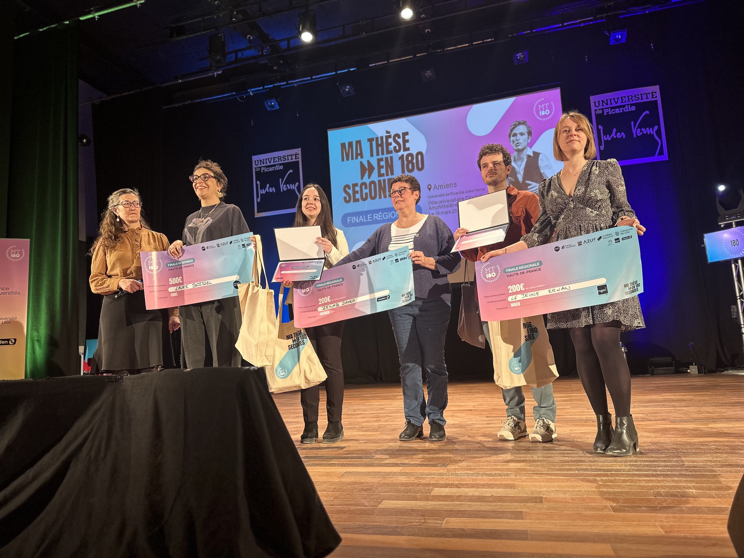 Ce 19 mars 2025, la finale régionale du concours Ma Thèse en 180 Secondes a réuni 12 doctorants issus de l'UPJV, de l'Université de Lille, de l'Université d'Artois, de l'ULCO et de Centrale Lille Institut. Leur défi ? Présenter leur sujet de recherche en trois minutes, en français et avec des termes simples, devant un auditoire diversifié.