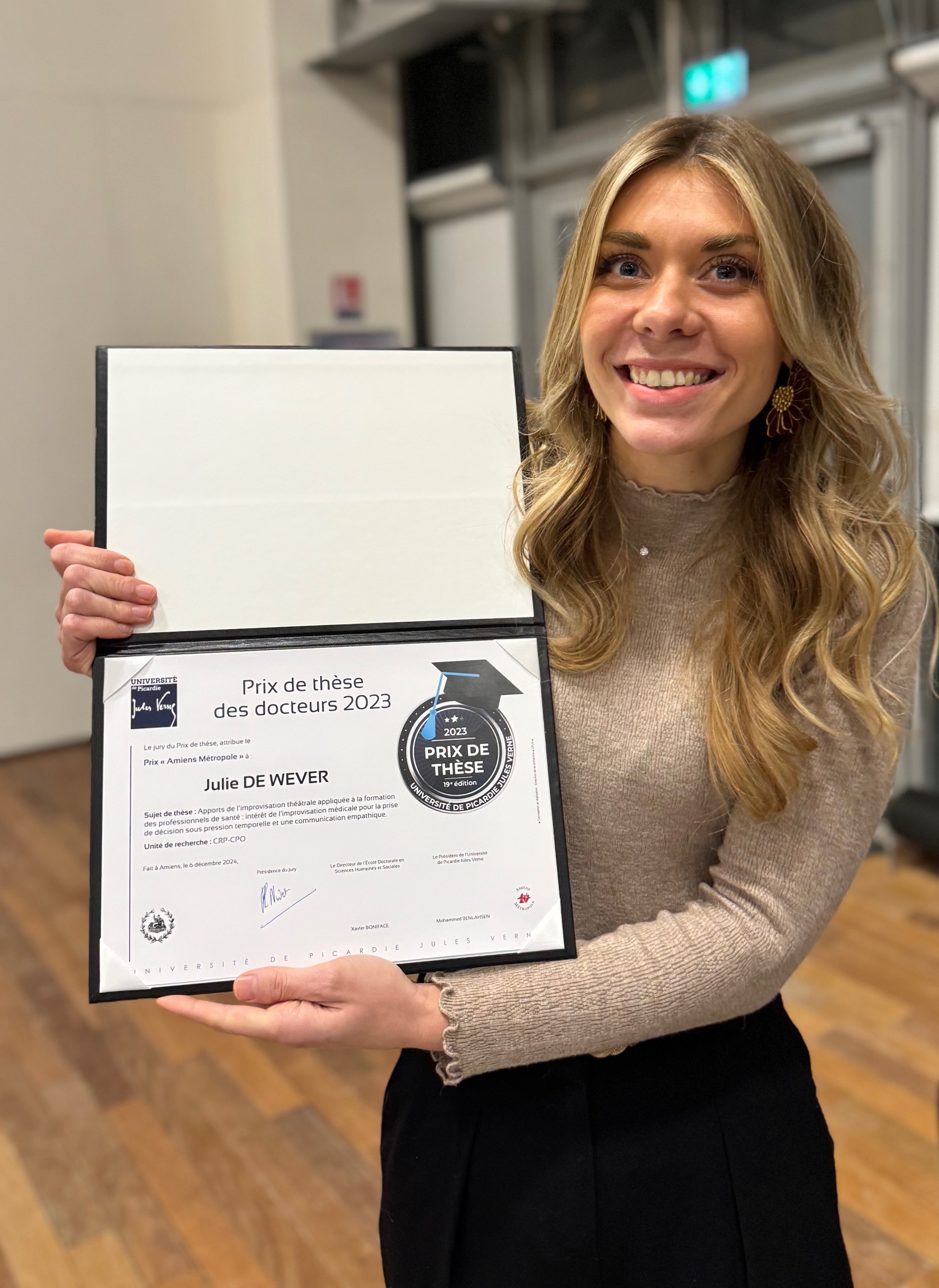 Ce prix représente une reconnaissance importante de l’intérêt des innovations pédagogiques qui ont pu être développées dans cette thèse, de la rigueur scientifique de ce travail ainsi que de l’engagement de tous les acteurs qui ont contribué à cette recherche. Cela, pour améliorer les pratiques pédagogiques, la qualité des soins et l’expérience des patients.